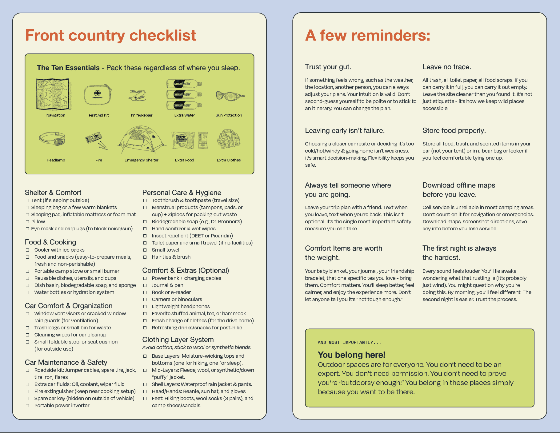 Download the pdf summary to view a full front country checklist, a trip plan template you can send to your friends/family, and a few final reminders from your friends at Bear With Me.